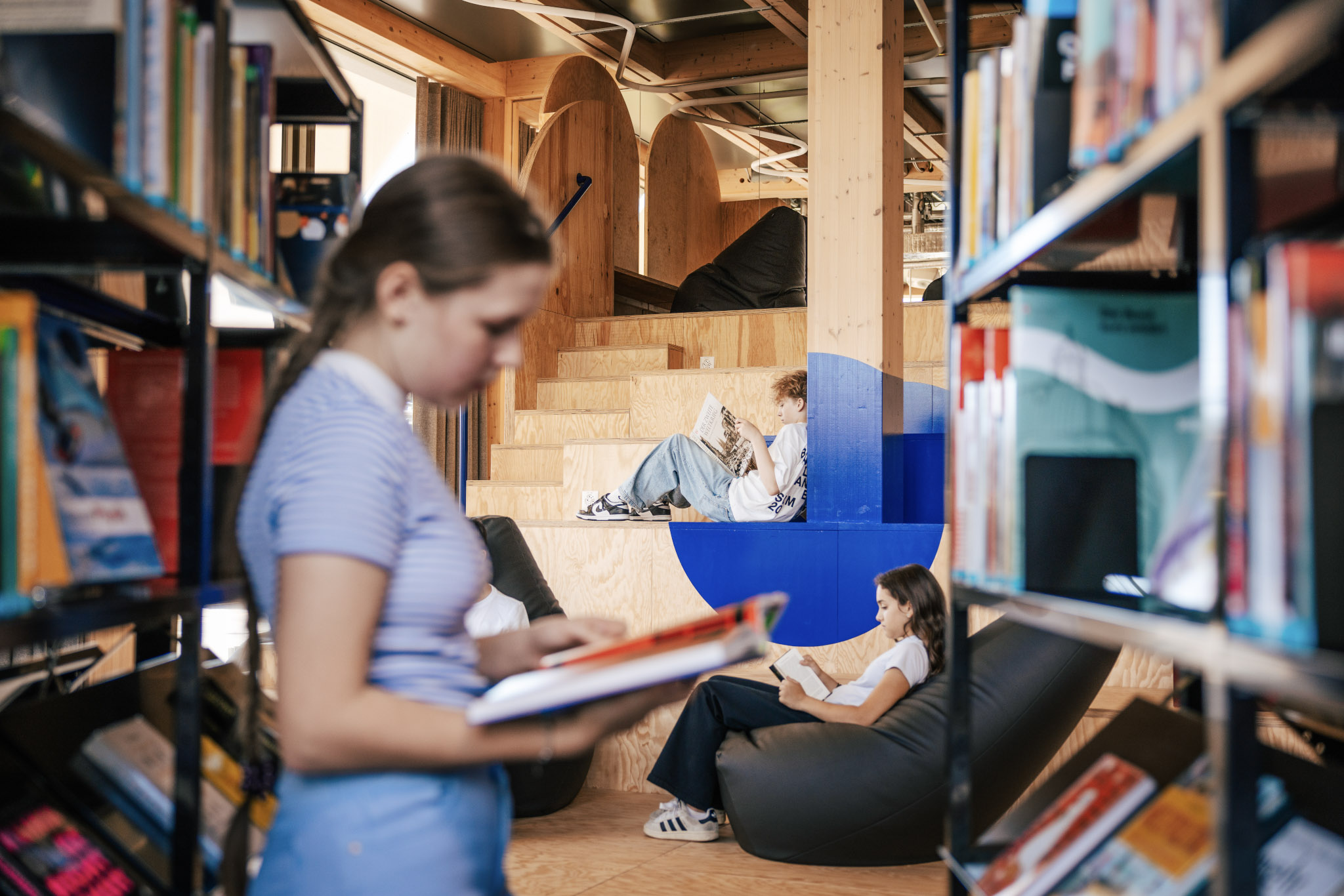 Die Mediothek der KS Rotkreuz ist direkt beim Eingang im Erdgeschoss. Sie enthält eine Ausleihtheke, Bücherregale, eine kleine Lounge, einige Arbeitsplätze am Fenster und eine Sitztreppe mit einer kleinen Bühne davor.