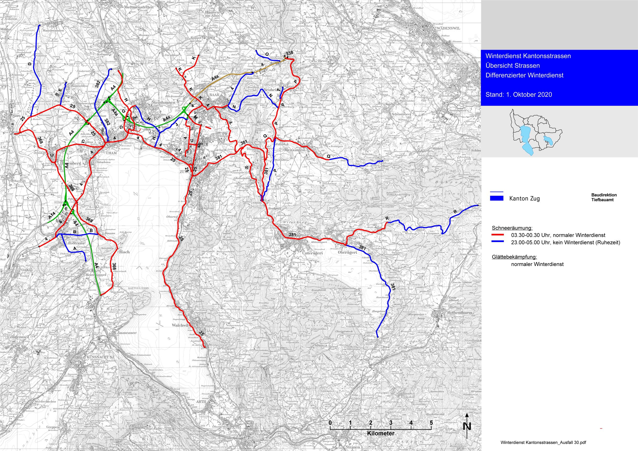 Bereits Ende September hat sich der kommende Winter mit Schnee in den höheren Lagen des Kantons Zug angekündigt. Ab Anfang November ist auch mit winterlichen Verhältnissen bis in die Niederungen zu rechnen. Die Abteilung Strassenunterhalt des Tiefbauamts ist ab diesem Zeitpunkt für gezielte Winterdiensteinsätze gerüstet. Diese umfassen die Schneeräumung, die Glättebekämpfung und den Schutz vor Schneeverwehungen auf den Kantonsstrassen und deren Gehwegen innerorts und ausserorts der Gemeinden. Mit dem Winterdienst werden die Voraussetzungen dafür geschaffen, dass die Strassen mit wintertauglich ausgerüsteten Fahrzeugen und mit angepasster Fahrweise sicher befahren werden können.