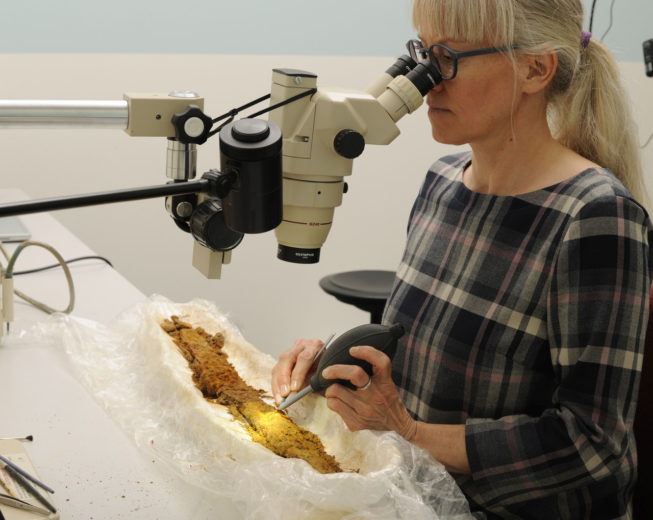Restauratorin Maria Ellend im Labor beim Freilegen des Eisenschwerts und der Festigung der anhaftenden Stoff- und Lederreste. (© ADA Zug, Andreas Eichenberger)