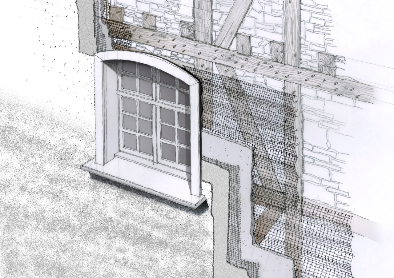 Nach der Entfernung des alten Putzes zeigten sich die unterschiedlich materialisierten Bauetappen: Bruchsteinmauerwerk mit Steingewänden, Fachwerk mit Holzgewänden. Da das Fachwerk historische Putzträger aufwies, entschied man, den Bau wieder zu verputzen. (© Zeichnung: André Bolliger)