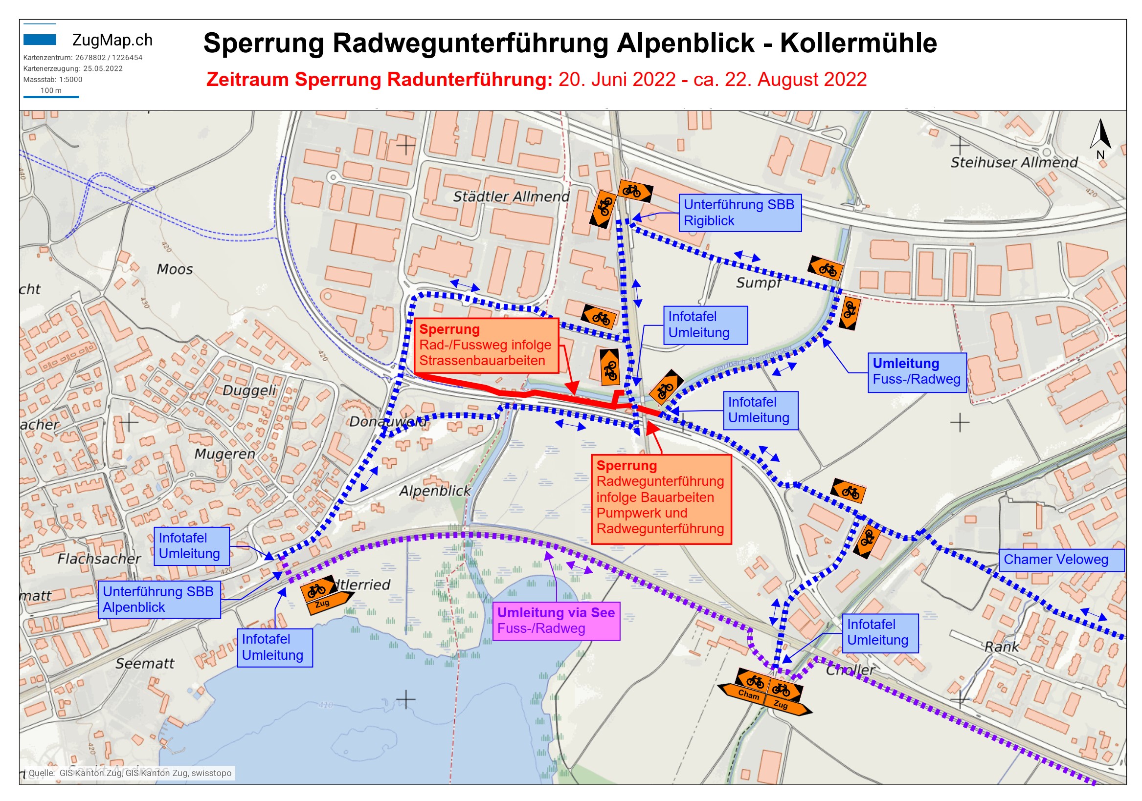 Die Streckensperrung für den Rad- und Fussverkehr dauert vom 20. Juni bis zirka 22. August 2022. Es stehen zwei Umleitungsrouten zur Verfügung. Einerseits die Strecke entlang dem Zugersee und anderseits die Verbindung über die S-Bahnhaltestelle Rigiblick. Entsprechende Hinweise finden sich auf der Webseite www.zg.ch/baustellen. Die Bauherrschaft trifft die nötigen Vorkehrungen, um Verkehrsbehinderungen auf ein Minimum zu beschränken.