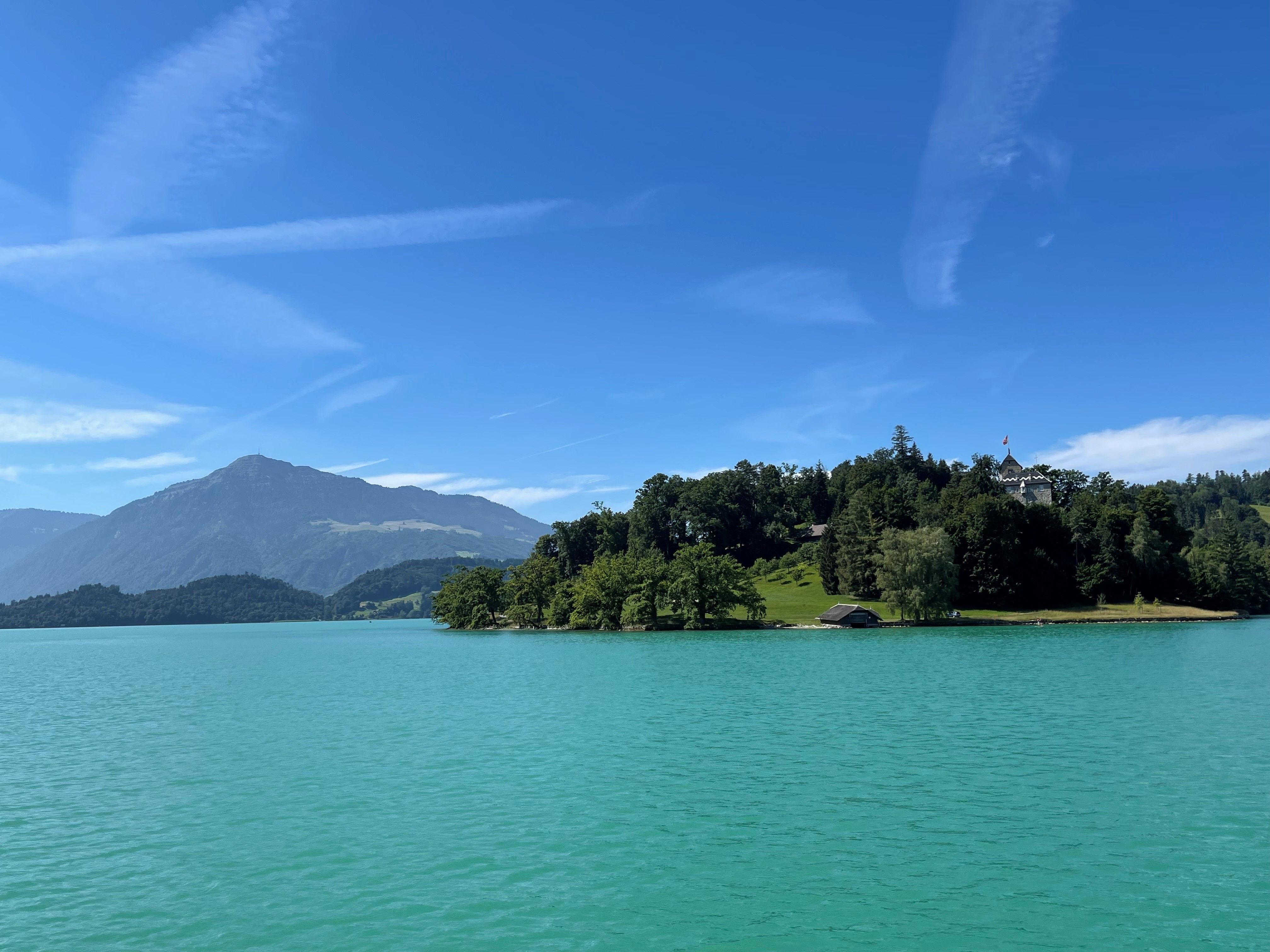 Blick vom Motorschiff Schwyz in Richtung Halbinsel Buonas und dem Chiemen mit der Rigi im Hintergrund.