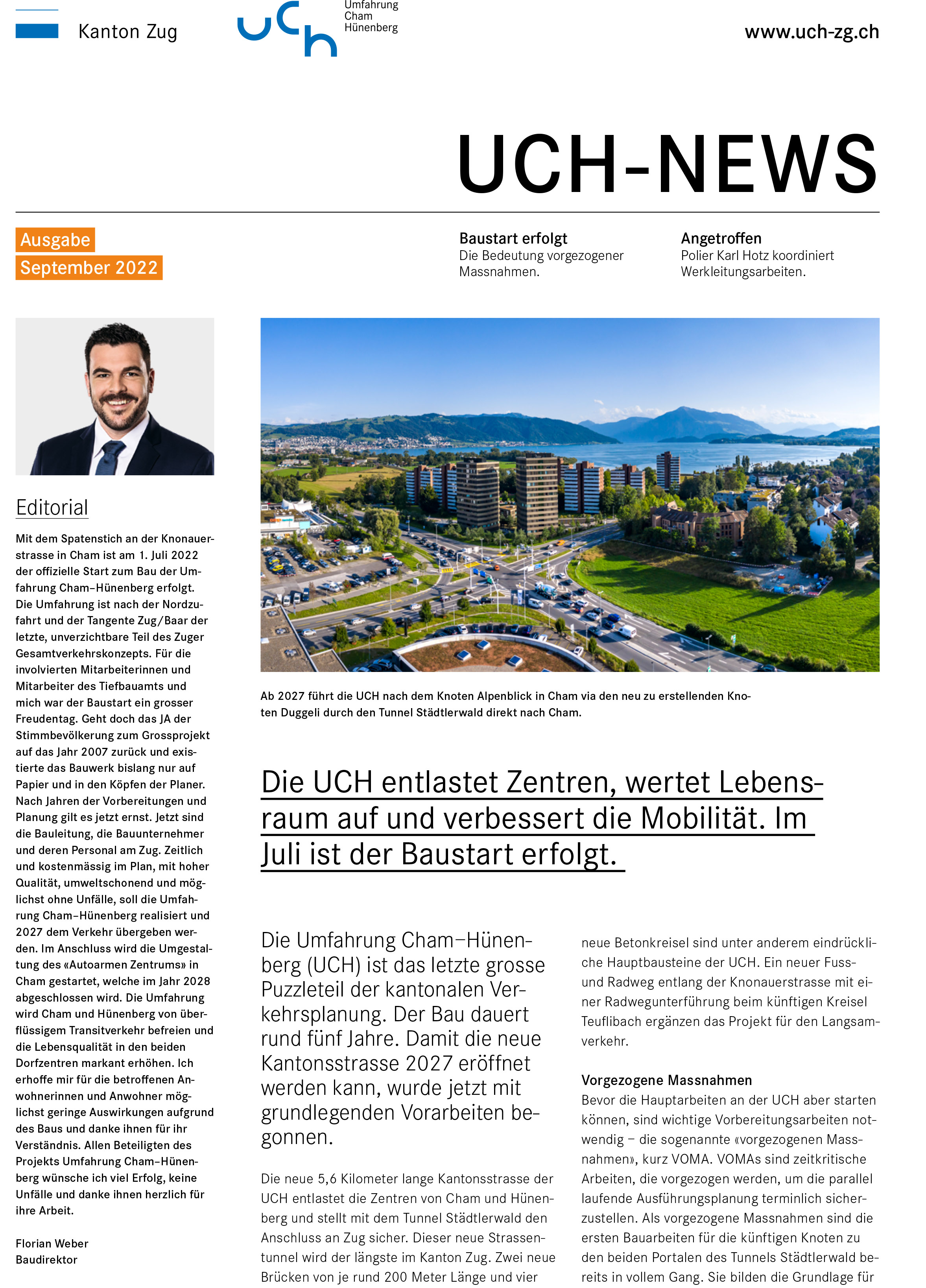 Seit Anfang Juli 2022 haben mit dem Spatenstich die offiziellen Arbeiten der Umfahrung Cham–Hünenberg (UCH) begonnen. Mit den UCH-News bedient die Bauherrschaft diesen Monat erstmals die interessierte Öffentlichkeit mit zusätzlichen Neuigkeiten und Hintergrundinformationen rund um das Projekt Umfahrung Cham–Hünenberg. Der Newsletter steht ab sofort auf der Projektwebseite www.uch-zg.ch zum Herunterladen und Abonnieren bereit. Er soll zwei Mal jährlich erscheinen und die periodischen Medienmitteilungen der Baudirektion zur UCH ergänzen.Wetter begünstigt Bodenarbeiten