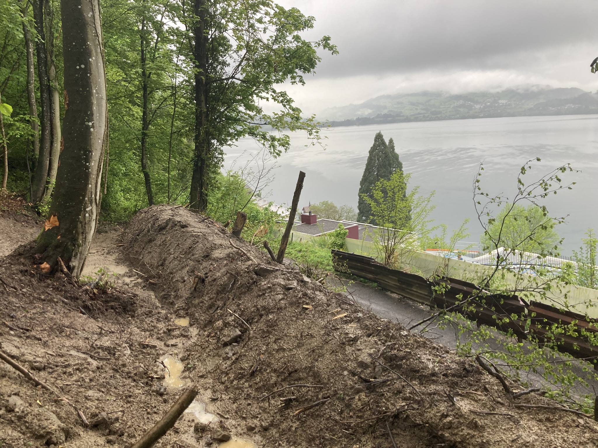Um künftig Steine und kleine Blöcke aus der Felswand am Ende der Auslaufstrecke zurückzuhalten, wurde oberhalb der Waldstrasse bereits ein kleiner Erdwall erstellt. Dieser permanente Schutzdamm, ein temporär montiertes Steinschlagschutznetz sowie auf der Strasse aufgestellte Stahlpalisaden bieten während der anstehenden Felsräumung dreifachen Schutz für die unterliegenden Gebäude. Der instabile Felsblock wird Ende Mai oder anfangs Juni kontrolliert abgebaut und das Material mithilfe einer Transportseilbahn nach oben abgeführt.