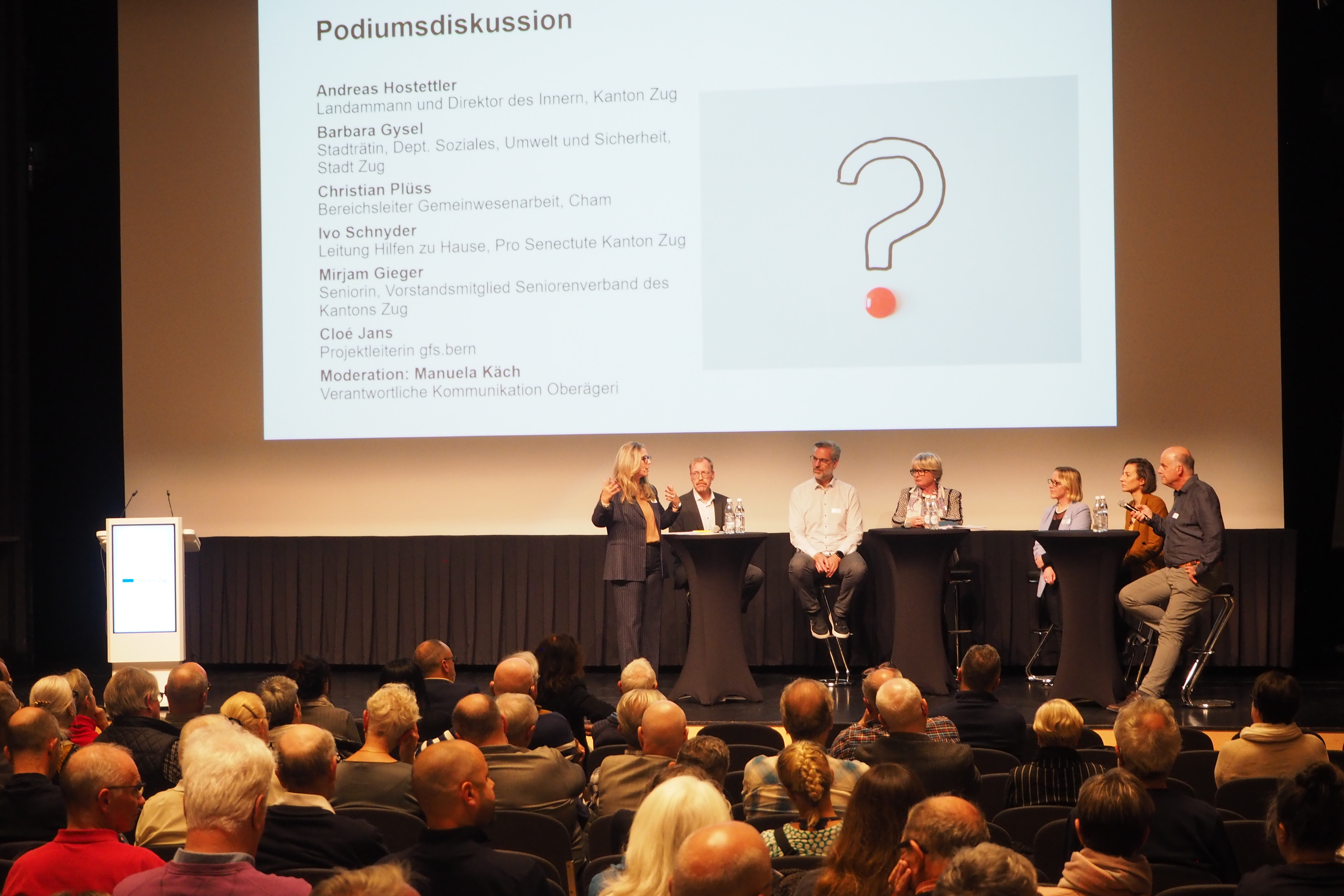 In der Podiumsdiskussion und der anschliessenden Fragerunde mit dem Publikum dominierten entsprechend Themen, bei denen die Stellschrauben im Kanton und in den Gemeinden noch nicht optimal eingestellt sind. Dazu gehört etwa der Bedarf nach altersgerechten Wohnformen und nach zentralen Anlaufstellen für Fragen übers Älterwerden. Auf dem Podium diskutierten Andreas Hostettler (Landammann), Barbara Gysel (Departementsvorsteherin Soziales, Umwelt und Sicherheit Stadt Zug), Christian Plüss (Gemeinwesenarbeit Cham), Ivo Schnyder (Geschäftsleitungsmitglied Pro Senectute Zug), Mirjam Gieger (Vorstand Seniorenverband Zug) und Cloé Jans (Senior Projektleiterin gfs.bern), die Moderation des ganzen Abends übernahm Manuela Käch (Kommunikation Gemeinde Oberägeri).