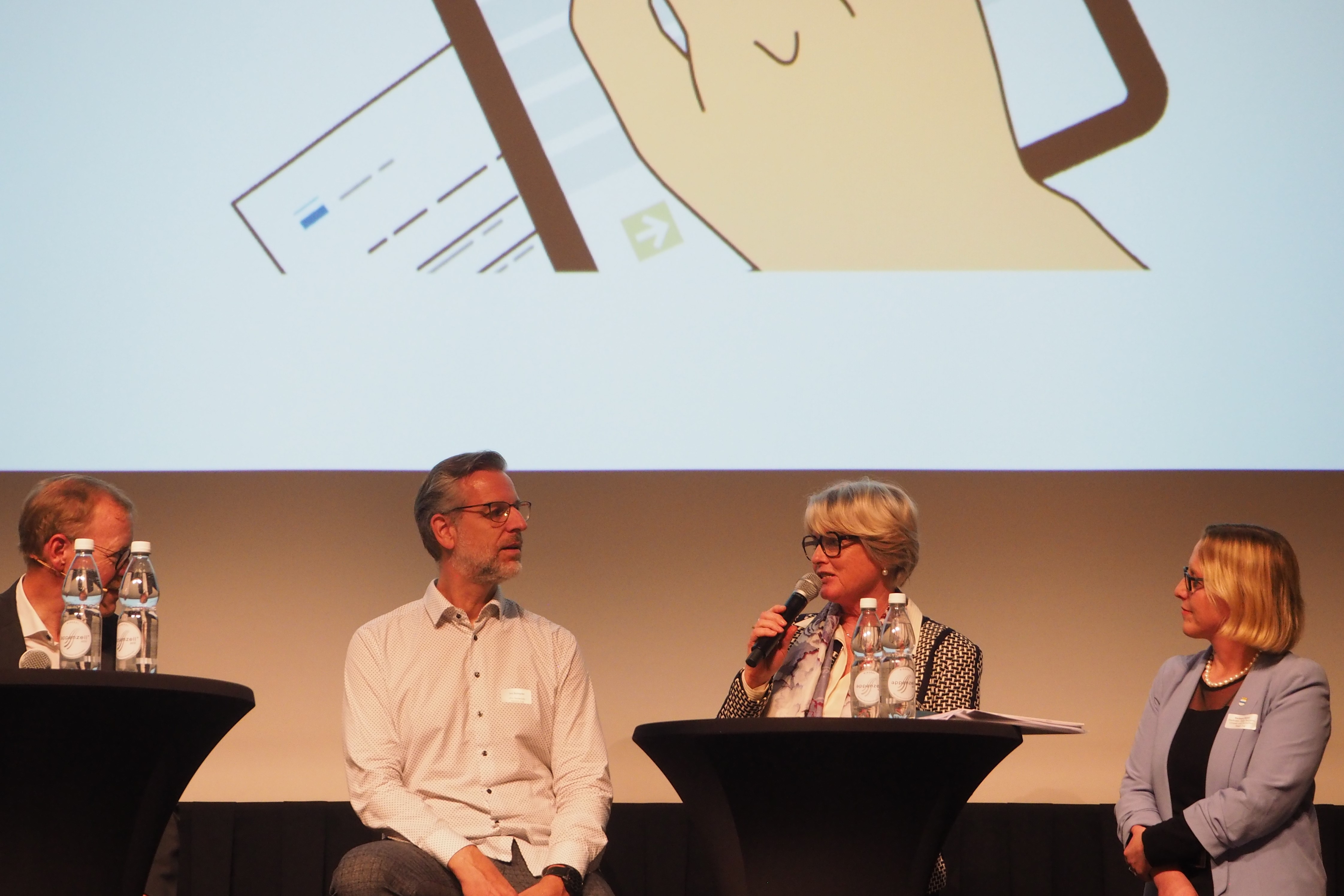 Bild 1: Podiumsdiskussion mit Manuela Käch (Moderation), Andreas Hostettler, Ivo Schnyder, Mirjam Gieger, Barbara Gysel, Cloé Jans, Christian Plüss (v.l.) [Foto: Kantonales Sozialamt]