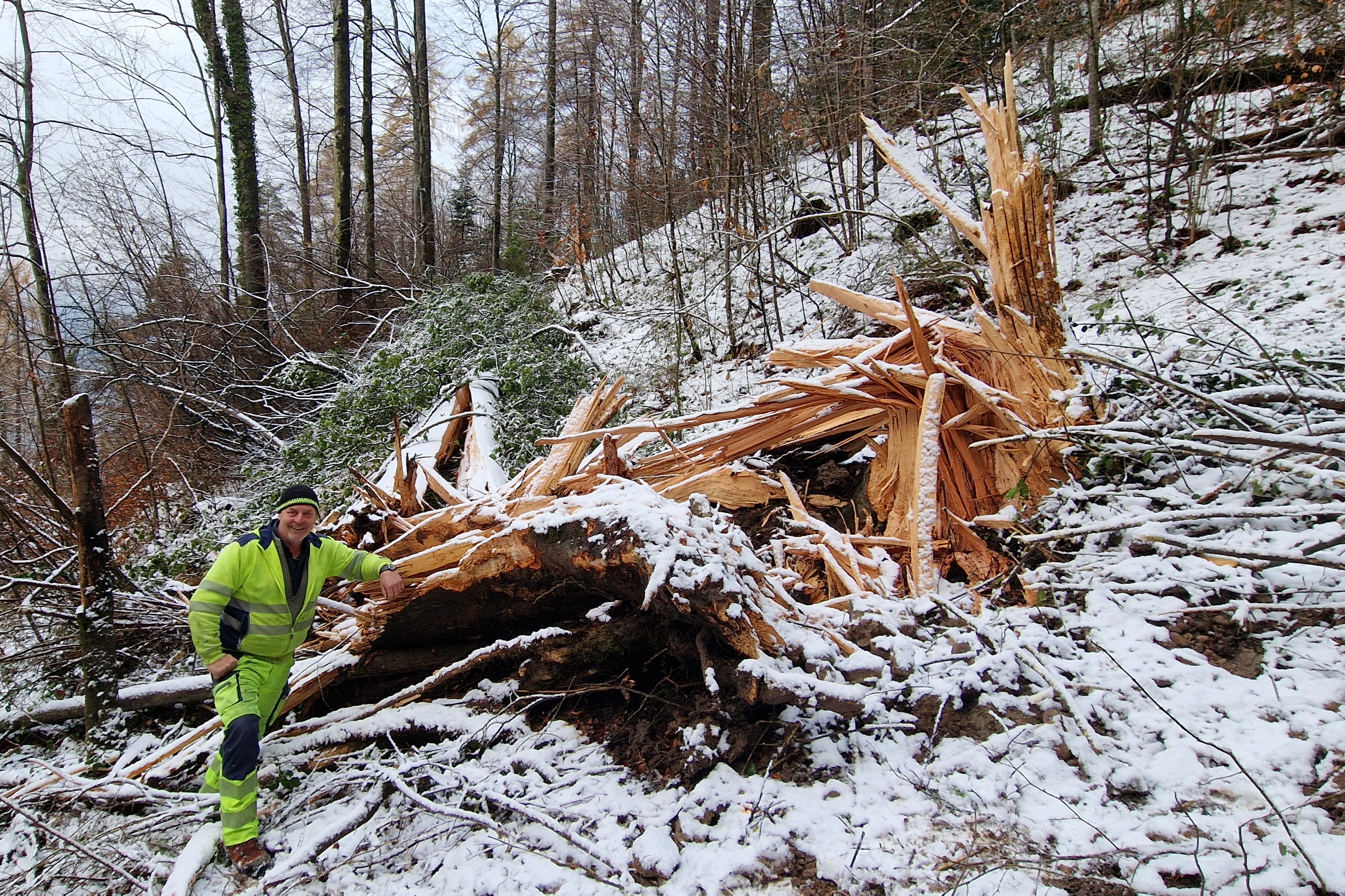 Bild 4: Waldschneise mit umgeknickten Bäumen (Foto: Amt für Wald und Wild)