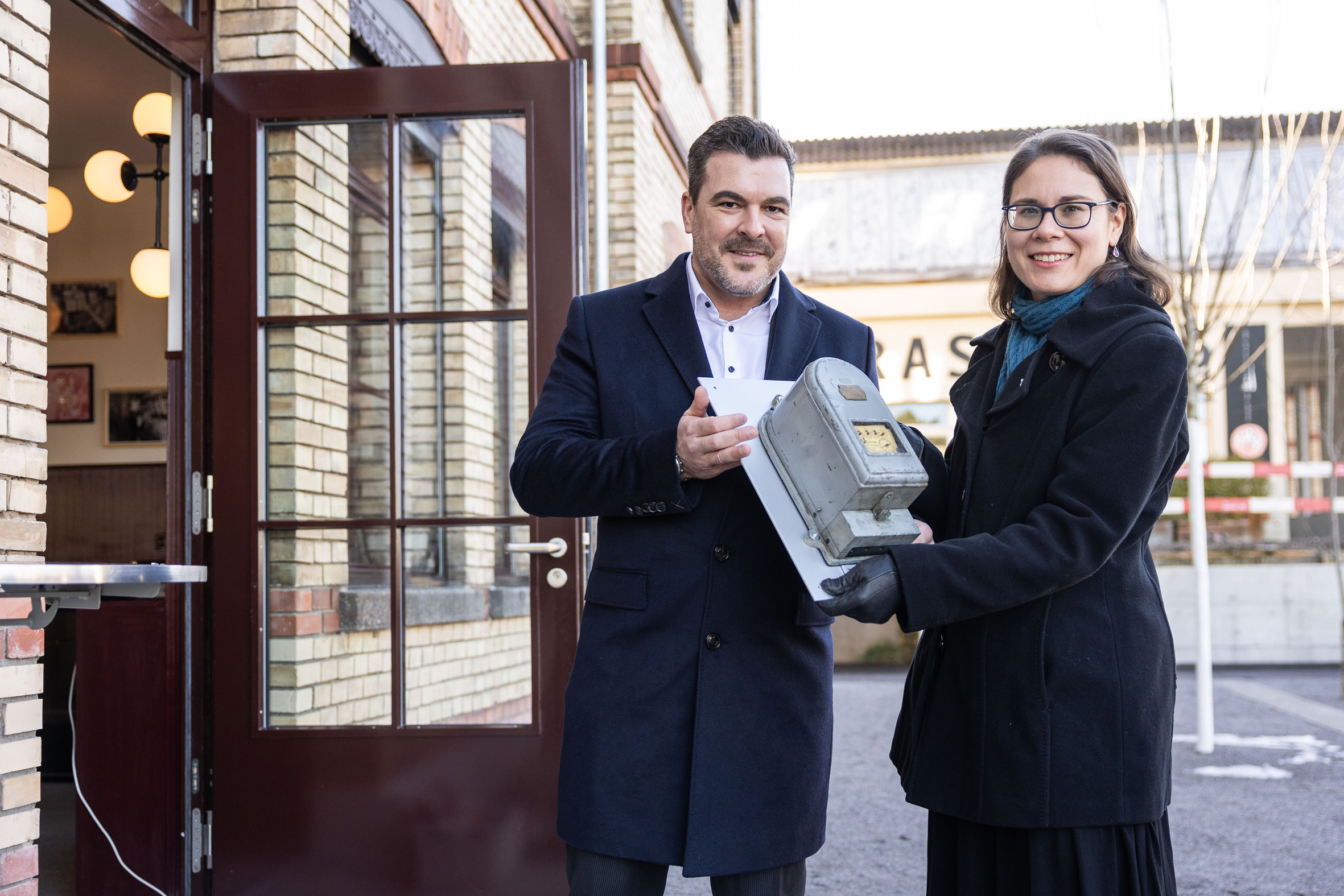 Symbolische Schlüsselübergabe: Baudirektor Florian Weber übergibt Verwaltungsgerichtspräsidentin Diana Oswald einen LG-Original-Stromzähler.
